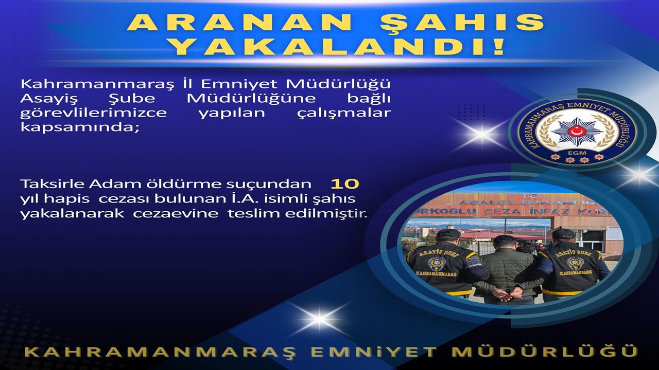 Kahramanmaraş İl Emniyet Müdürlüğü Asayiş Şube Müdürlüğü ekiplerince yürütülen çalışmalar kapsamında, hakkında kesinleşmiş hapis cezası bulunan bir şahıs yakalandı.