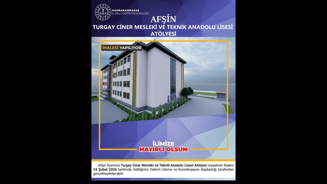 Kahramanmaraş’ın Afşin ilçesinde mesleki ve teknik eğitimi güçlendirecek önemli bir yatırım daha hayata geçiriliyor. 2026 Yılı Yatırım Programı kapsamında Turgay Ciner Mesleki ve Teknik Anadolu Lisesi bünyesinde yapılacak yeni atölye binası için ihale gerçekleştirilecek.
