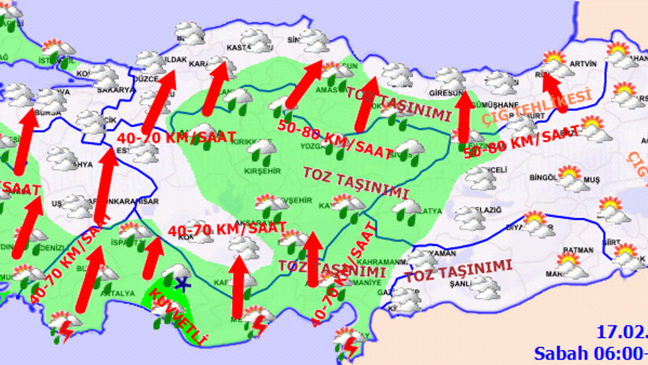 Rüzgarın bölge genelinde güney yönlerden 40-70 km/saat hızla, kısa süreli fırtına şeklinde esmesi tahmin ediliyor. Ayrıca bölge genelinde toz taşınımı bekleniyor. Bu durum çamur yağışı, hava kalitesinde düşüş ve görüş mesafesinde azalma gibi olumsuzluklara yol açabilir.