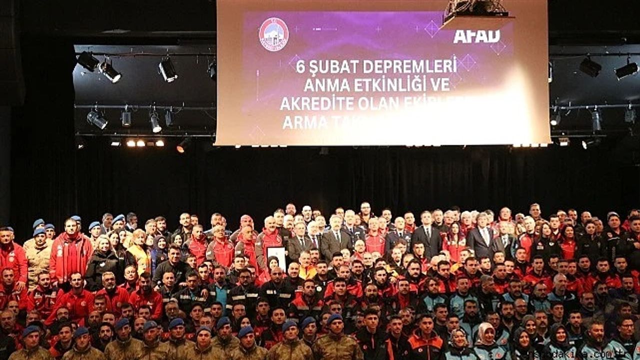 Kayseri'de, Kahramanmaraş merkezli 6 Şubat 2023'teki depremlerin 3. yılı dolayısıyla düzenlenen törende akredite olan arama kurtarma ekiplerine armaları takıldı.