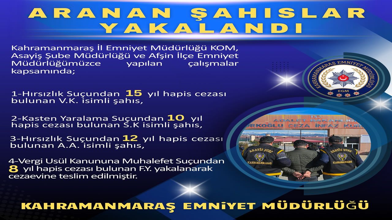 Kahramanmaraş İl Emniyet Müdürlüğü ekipleri, aranan şahısların yakalanmasına yönelik yürütülen çalışmalar kapsamında önemli bir operasyona imza attı. KOM ve Asayiş Şube Müdürlükleri ile Afşin İlçe Emniyet Müdürlüğü ekiplerinin koordineli çalışmaları sonucu, haklarında kesinleşmiş hapis cezası bulunan dört kişi yakalandı.