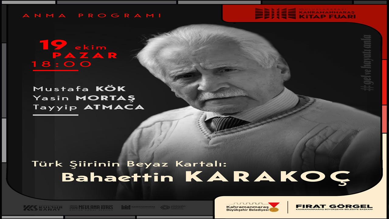 Kahramanmaraş’ın yetiştirdiği en önemli edebiyatçılardan Bahaettin Karakoç, vefatının yıl dönümü dolayısıyla 19 Ekim Pazar günü 10. Uluslararası Kahramanmaraş Kitap Fuarı’nda düzenlenecek programla yad edilecek. KAFUM’da düzenlenecek program saat 18.00’da başlayacak.