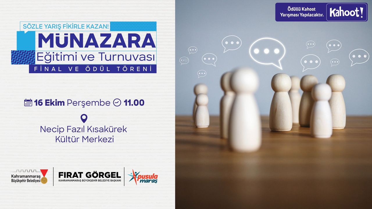Gençlere yönelik projeleriyle adından söz ettiren Kahramanmaraş Büyükşehir Belediyesinin gençlerin kişisel gelişimine katkı sunması için hayata geçirdiği “Münazara Eğitimi ve Turnuvası” final aşamasına geldi. Lise öğrencilerinden oluşan 70 takımla başlayan organizasyonda 4 takım finale kaldı. 16 Ekim Perşembe günü Necip Fazıl Kısakürek Kültür Merkezi’nde jüri karşısına çıkacak olan 4 takım, argümanlarını savunarak kıyasıya rekabet edecek. Saat 11.00’da başlayacak heyecan verici finali tüm vatandaşlar takip edebilecek. Ayrıca turnuvayı izlemeye gelen vatandaşlar arasında da Kahoot bilgi yarışması yapılarak organizasyona eğlence katılacak. Büyükşehir Belediyesinden yapılan açıklamada, tüm vatandaşların programı takip etmeye davetli olduğu belirtildi.