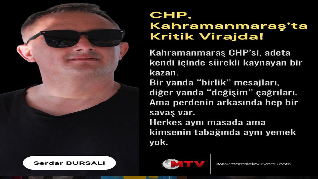 Maraş Televizyonu (MTV) Sahibi ve İmtiyaz Sahibi Serdar Bursalı facebook’taki sayfasından yaptığı yorumda “CHP, Kahramanmaraş’ta Kritik Virajda” diyerek, şunları yazdı: