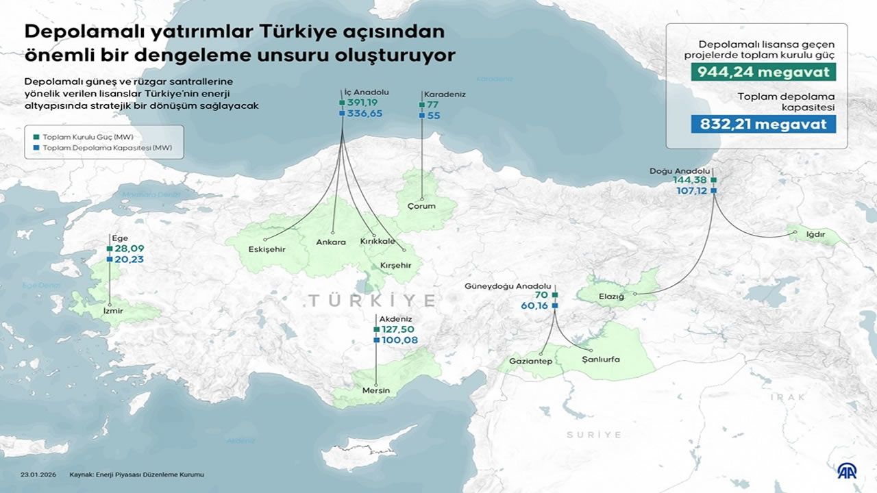 Depolamalı lisans alan projelerde toplam kurulu güç 944,24 megavata, toplam depolama kapasitesi ise 832,21 megavata ulaştı. Bu yatırımlar, yenilenebilir enerjinin kesintili üretim yapısından kaynaklanan dalgalanmaları azaltarak sistemde dengeleme unsuru oluşturmayı hedefli.