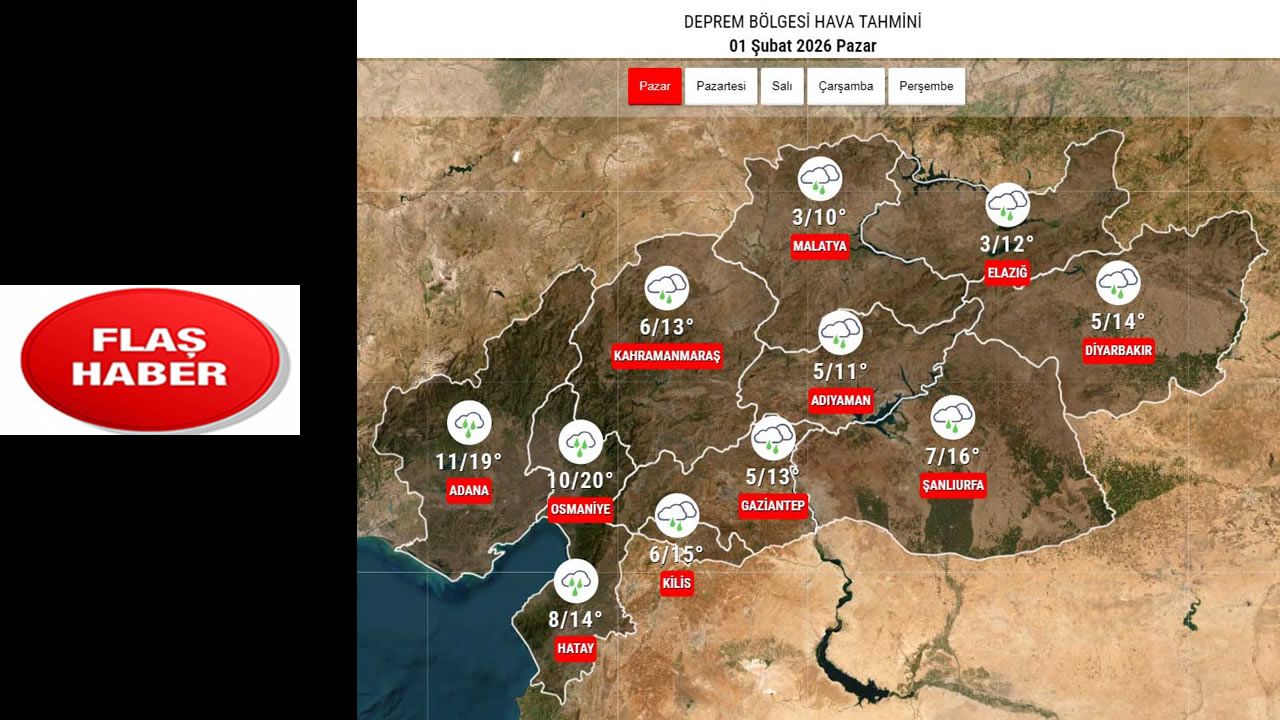 Deprem bölgesindeki iller yeni haftaya yağışlı ve serin bir havayla giriyor. Meteoroloji verilerine göre 1 Şubat Pazar günü bölge genelinde gök gürültülü sağanak ve aralıklı yağmur beklenirken, sıcaklıklar mevsim normallerinde seyredecek.