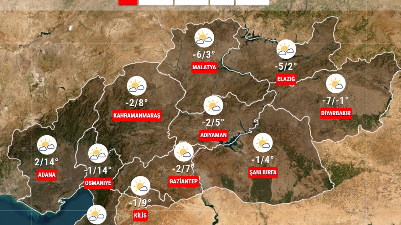 En düşük sıcaklık Diyarbakır’da -7 derece, Malatya’da -6 derece, Elazığ’da -5 derece olarak tahmin ediliyor. Gaziantep, Adıyaman ve Kahramanmaraş’ta ise gece sıcaklıkları -2 derece civarında seyredecek. Gündüz saatlerinde sıcaklıklar artış gösterse de birçok kentte hava serin kalacak.