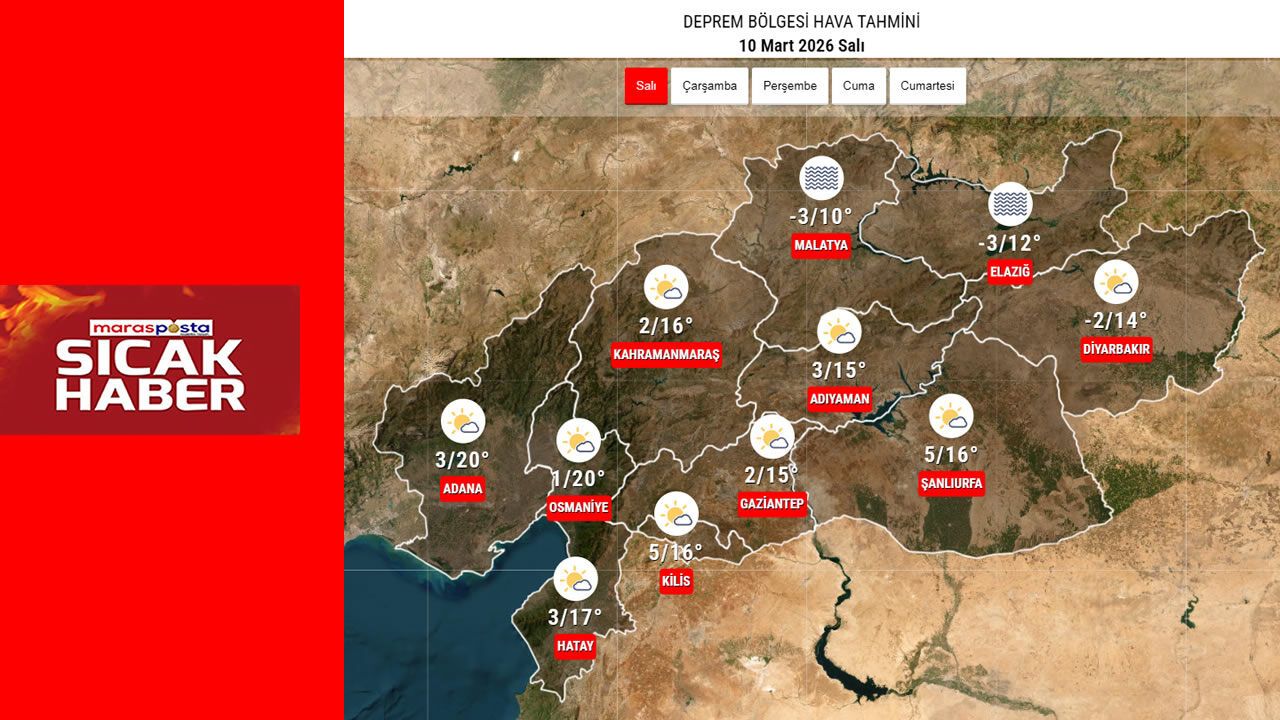 Meteoroloji verilerine göre 6 Şubat depremlerinden etkilenen illerin bulunduğu bölgede 10 Mart Salı günü genel olarak az bulutlu ve parçalı bulutlu bir hava etkili olacak. Bölge genelinde yağış beklenmezken, gece saatlerinde bazı illerde sıcaklıkların sıfırın altına düşmesi dikkat çekiyor.