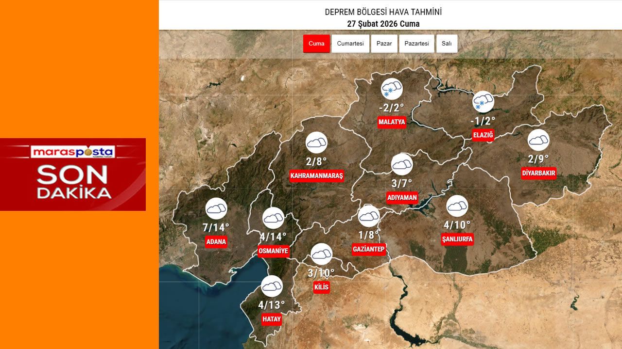 Deprem bölgesini kapsayan illerde 27 Şubat Cuma günü soğuk ve yer yer yağışlı hava etkisini sürdürecek. Özellikle yüksek kesimlerde karla karışık yağmur ve kar ihtimali dikkat çekerken, gece saatlerinde don ve buzlanma riski bulunuyor.