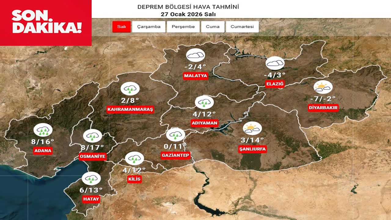Meteoroloji verilerine göre deprem bölgesinde 27 Ocak Salı günü parçalı ve çok bulutlu hava ile birlikte yer yer yağış etkili olacak. Birçok ilde sağanak yağmur beklenirken, gece saatlerinde sıcaklıkların sıfırın altına düşmesi nedeniyle don ve buzlanma riski bulunuyor.