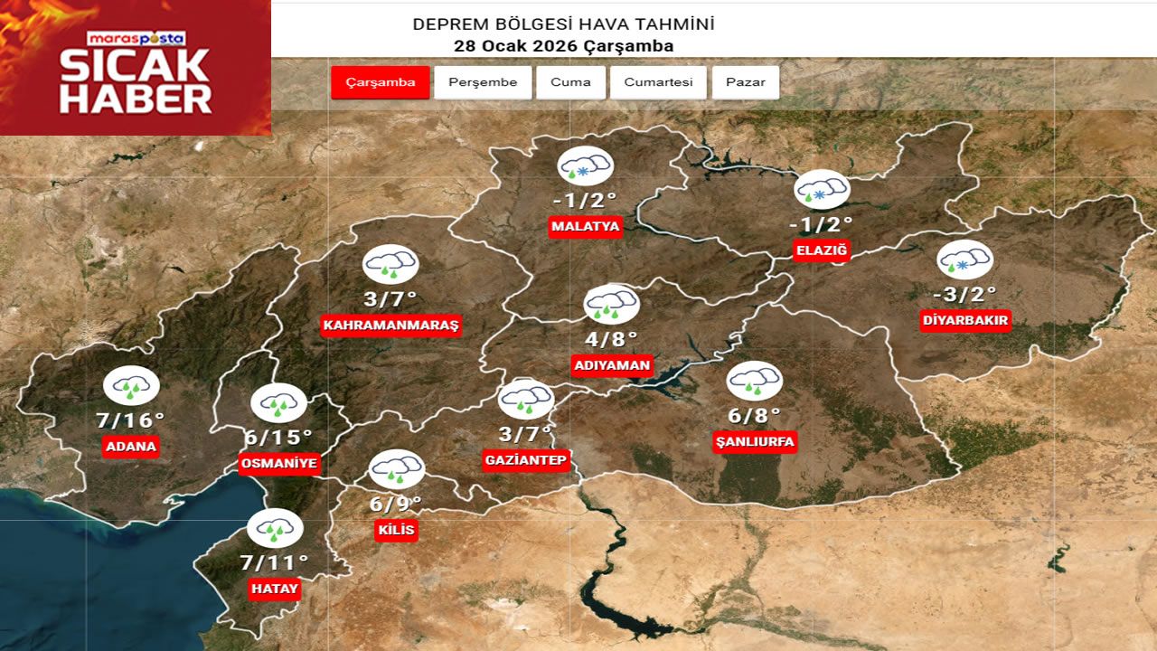 Meteoroloji verilerine göre deprem bölgesindeki iller yeni güne yağışlı ve yer yer soğuk bir havayla giriyor. Kıyı kesimlerde sağanak yağmur beklenirken, Malatya, Elazığ ve Diyarbakır çevrelerinde karla karışık yağmur ve kar yağışı görülecek.