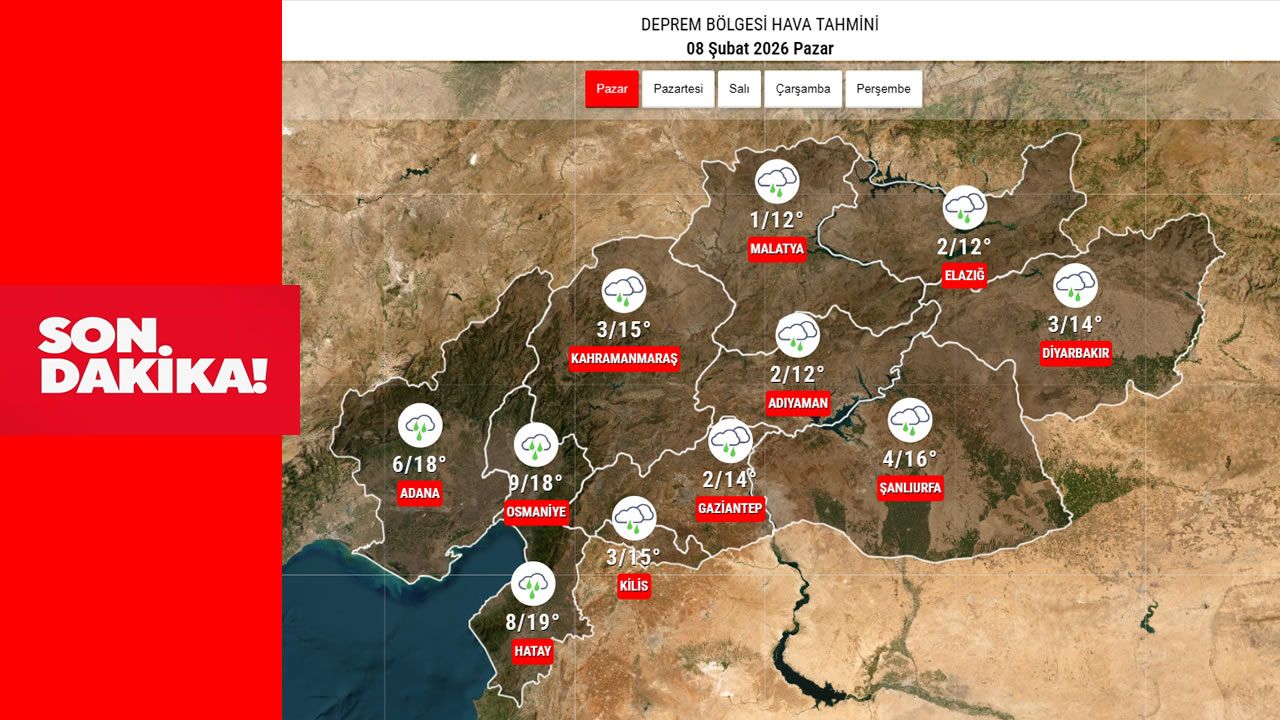 Meteoroloji verilerine göre deprem bölgesindeki iller yeni haftaya yağışlı ve serin bir havayla giriyor. 6 Şubat depremlerinden etkilenen şehirlerde pazar günü gök gürültülü sağanak ve aralıklı yağmur beklenirken, özellikle gece saatlerinde sıcaklıkların belirgin şekilde düşmesi öngörülüyor.