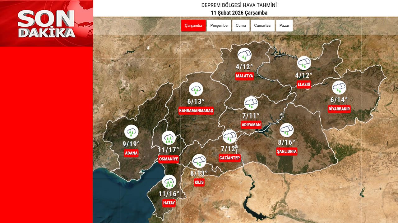 Deprem bölgesindeki illerde 11 Şubat Çarşamba günü gökyüzü bulutlu ve yağışlı olacak. Meteoroloji verilerine göre birçok kentte aralıklı sağanak yağmur beklenirken, sıcaklıklar mevsim normallerinin altında seyredecek.