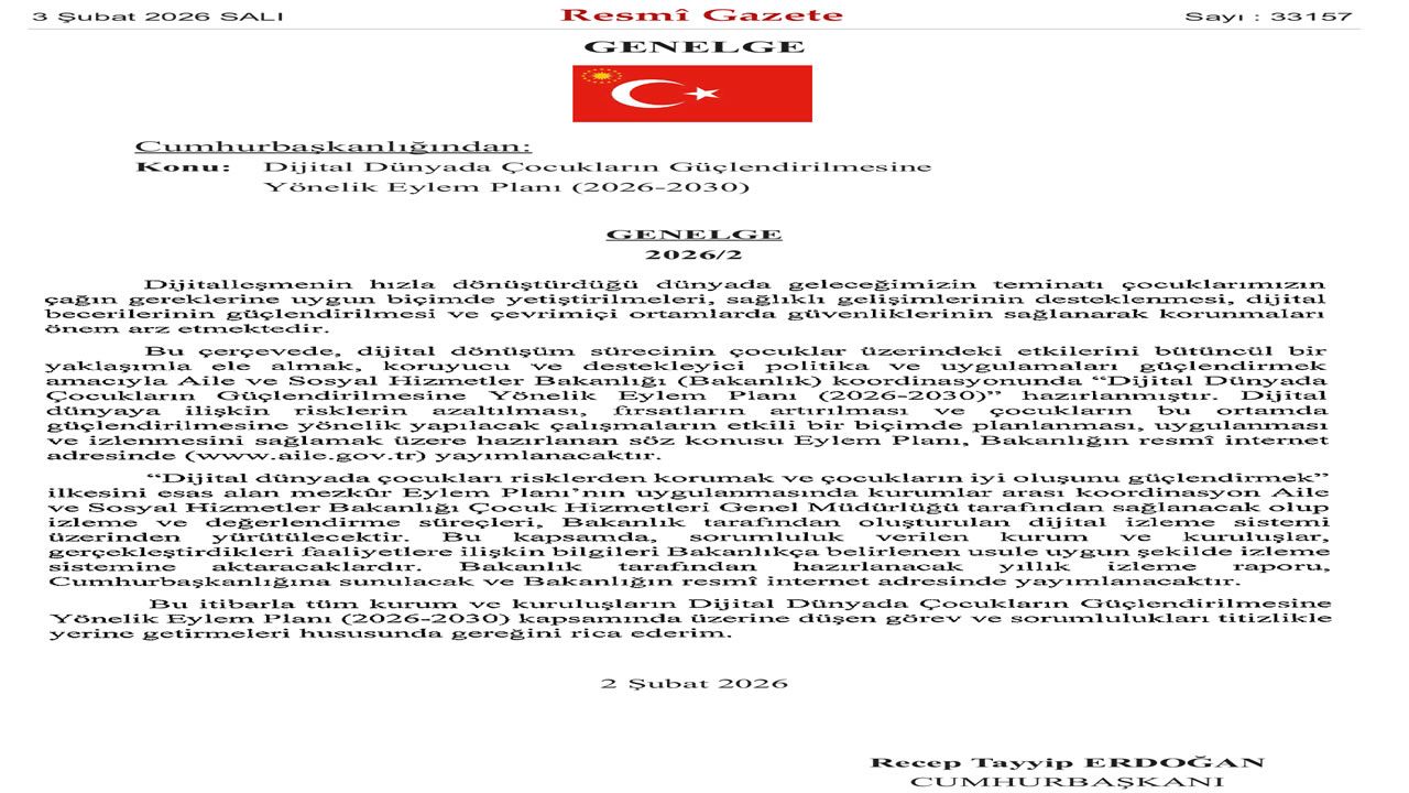 Dijital Dünyada Çocukların Güçlendirilmesine Yönelik Eylem Planı (2026-2030) konulu Cumhurbaşkanlığı Genelgesi, Resmi Gazete'de yayımlandı.