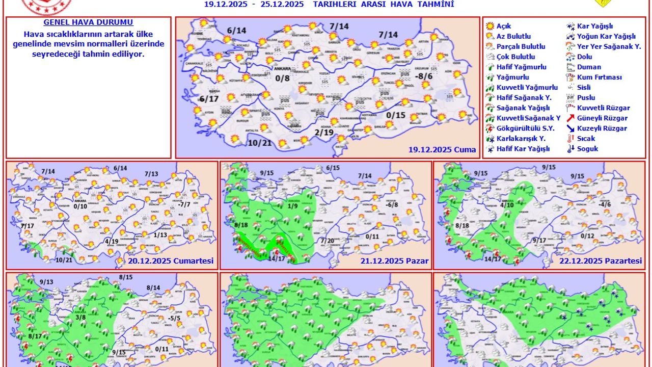 - 19–20 Aralık Cuma ve Cumartesi: Kahramanmaraş ve Doğu Akdeniz genelinde hava parçalı ve az bulutlu olacak. Önemli bir yağış beklenmiyor.