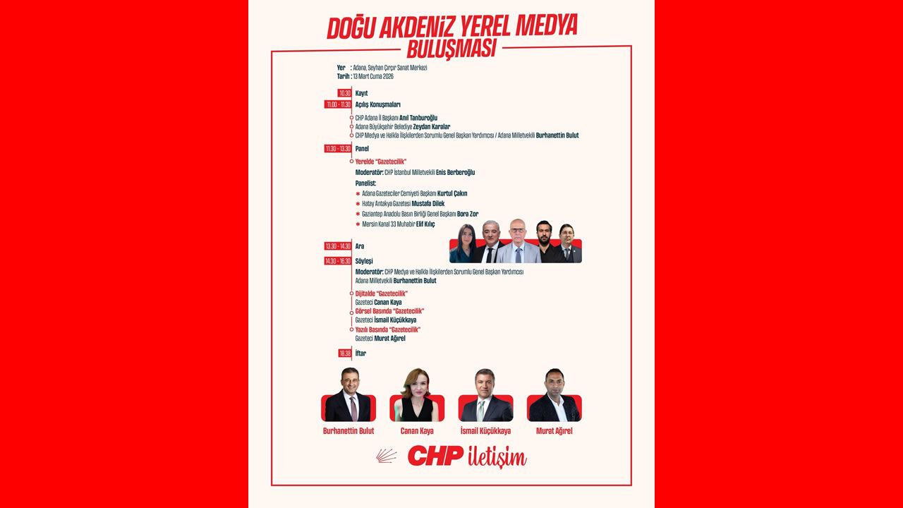 CHP İletişim tarafından organize edilen “Doğu Akdeniz Yerel Medya Buluşması”, 13 Mart 2026 Cuma günü Adana’da gerçekleştirilecek. Yerel medyanın sorunlarının ve gazeteciliğin farklı alanlarının ele alınacağı program, Seyhan Çırçır Sanat Merkezi’nde yapılacak.