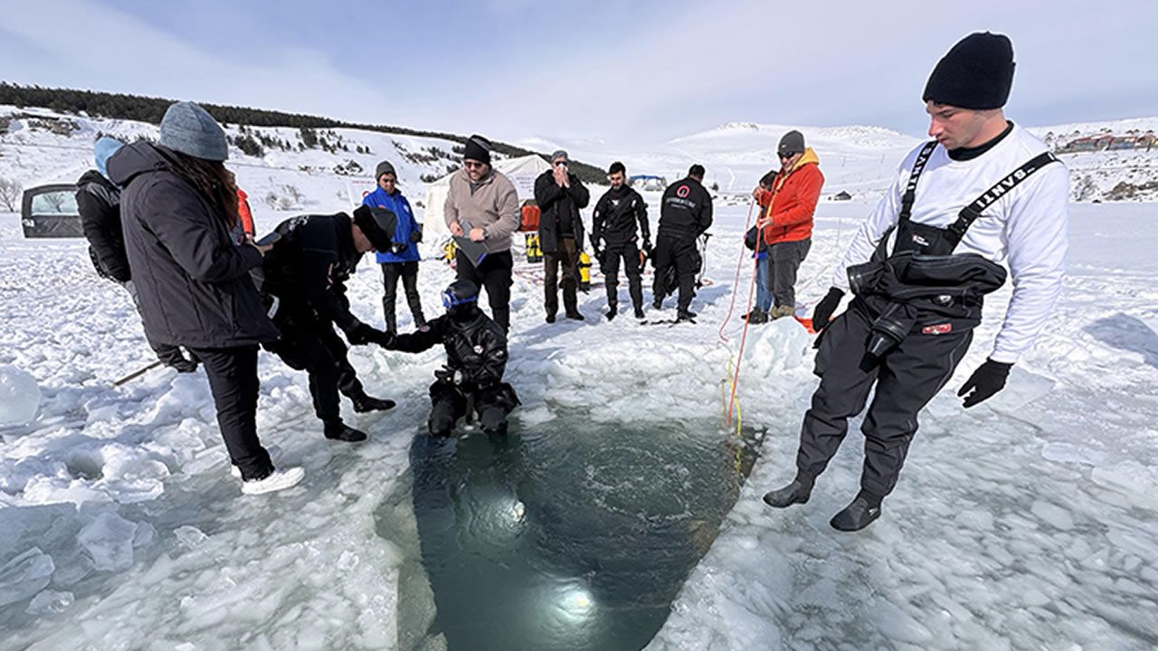 Günay Nuh / ARDAHAN (AA) - İskenderun Teknik Üniversitesi (İSTE) Denizcilik Teknolojileri Meslek Yüksekokulu akademisyen ve öğrencileri, yüksek irtifa buz altı dalışlarında deneyim kazanmak amacıyla yüzeyi buzla kaplı Çıldır Gölü'ne daldı.