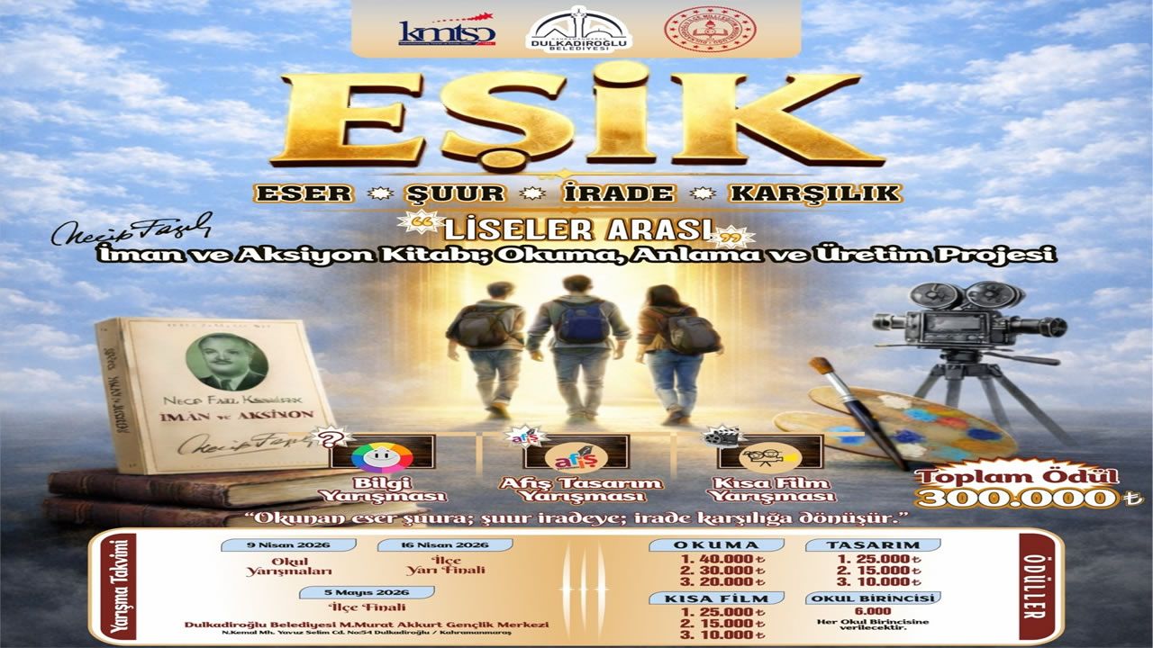 Dulkadiroğlu Belediyesi, Dulkadiroğlu İlçe Millî Eğitim Müdürlüğü ve Kahramanmaraş Ticaret ve Sanayi Odası iş birliğiyle hayata geçirilen EŞİK – Eser, Şuur, İrade, Karşılık Projesi ile liseli gençleri okuma, düşünme ve üretme sürecine dâhil ediyor. İlçe genelindeki lise öğrencilerine yönelik hazırlanan proje, kültür ve eğitim alanında kapsamlı bir çalışma olarak öne çıkıyor.