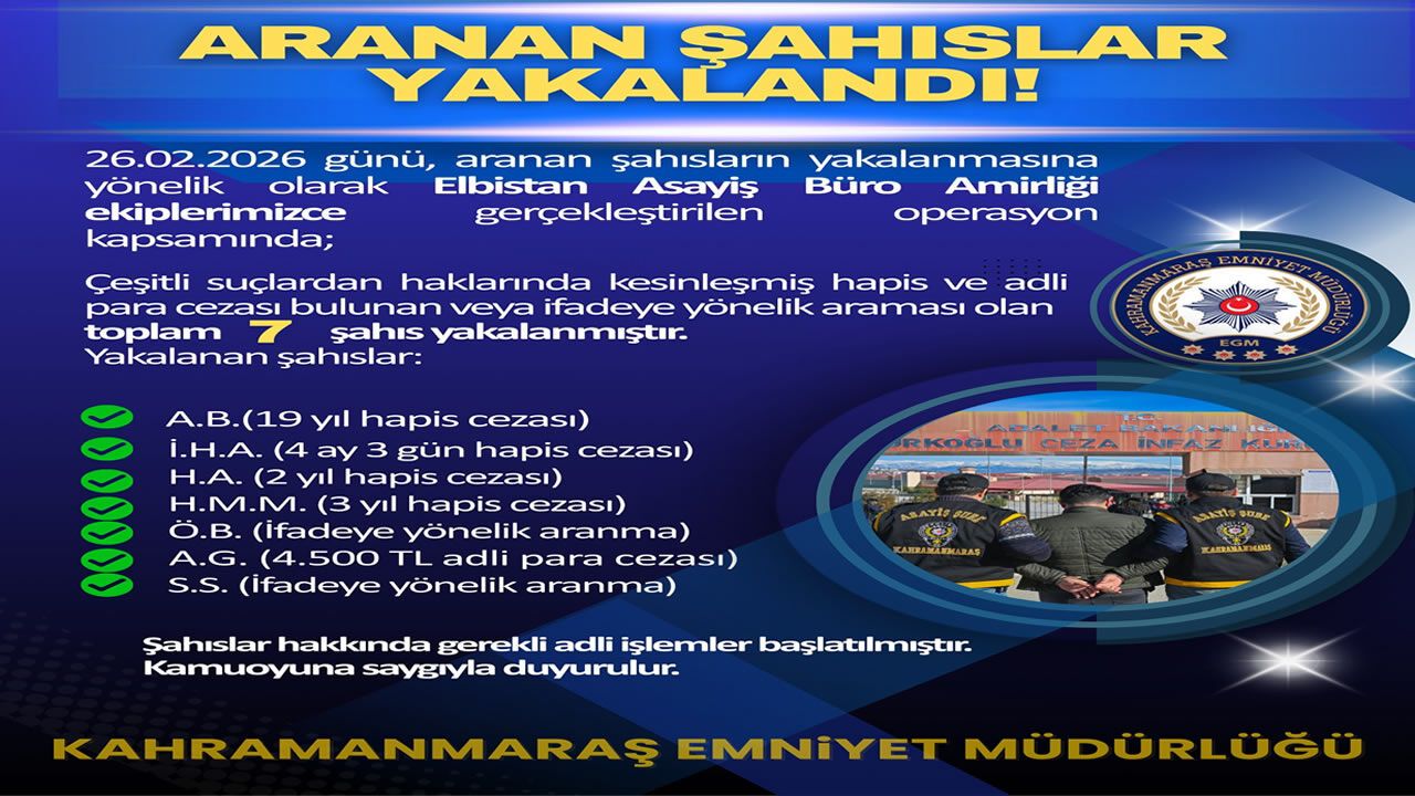 Kahramanmaraş Emniyet Müdürlüğü’ne bağlı Elbistan Asayiş Büro Amirliği ekipleri, aranan şahıslara yönelik yürüttüğü çalışma kapsamında 7 kişiyi yakalayarak adli mercilere teslim etti.