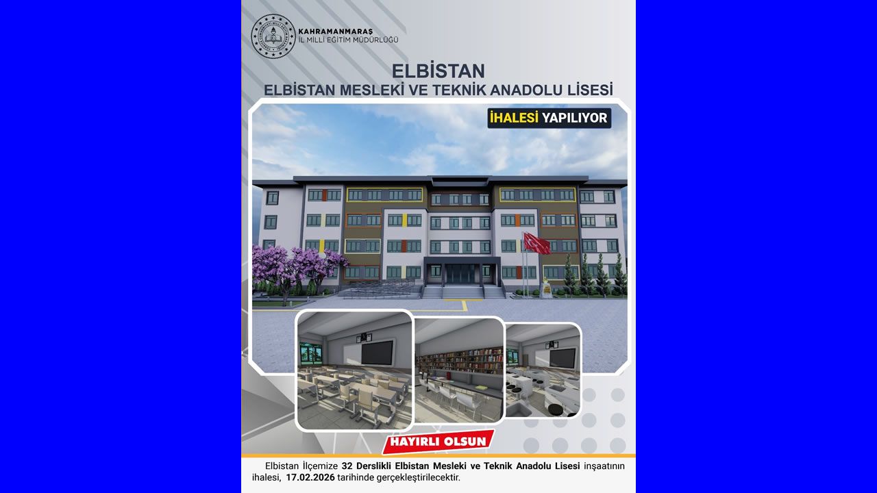 Kahramanmaraş’ın Elbistan ilçesinde mesleki ve teknik eğitimi güçlendirecek önemli bir yatırım daha hayata geçiriliyor. 2026 Yılı Yatırım Programı kapsamında Elbistan Mesleki ve Teknik Anadolu Lisesi’nin yapımı için ihale süreci başlatıldı.
