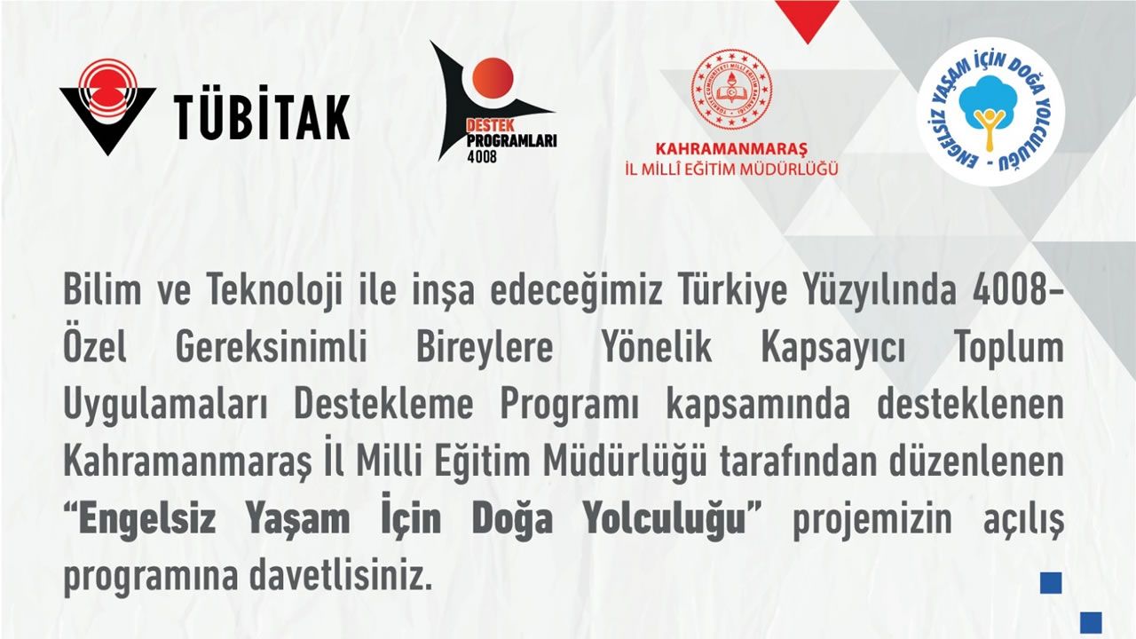 Bilimin ve teknolojinin ışığında şekillenen Türkiye Yüzyılı vizyonu çerçevesinde özel gereksinimli bireylerin toplumsal yaşama daha etkin katılımını sağlamak amacıyla hazırlanan “Engelsiz Yaşam İçin Doğa Yolculuğu” adlı TÜBİTAK 4008 projesi Kahramanmaraş’ta hayata geçiriliyor.