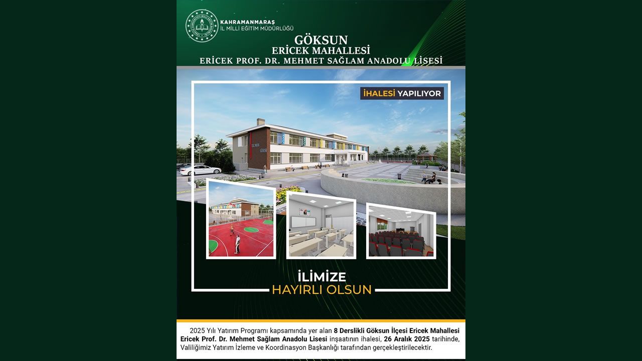 Göksun İlçesi Ericek Mahallesi’ne yeni bir eğitim yatırımı daha geliyor. 2025 Yılı Yatırım Programı kapsamında yapılması planlanan 8 derslikli Ericek Prof. Dr. Mehmet Sağlam Anadolu Lisesi için yapım ihalesine çıkılıyor.