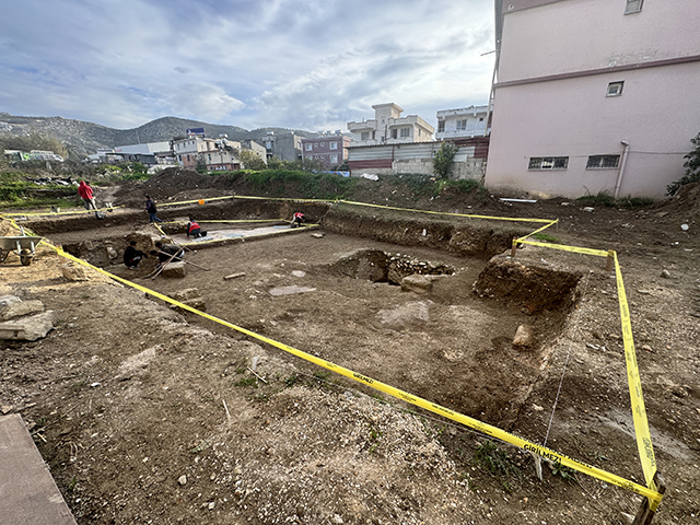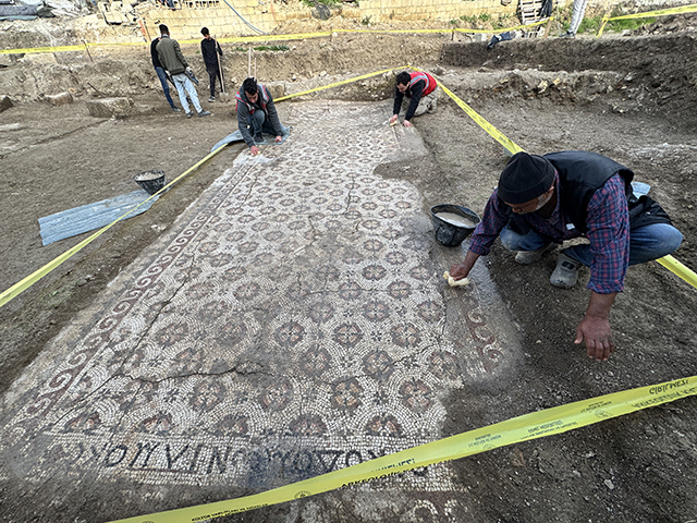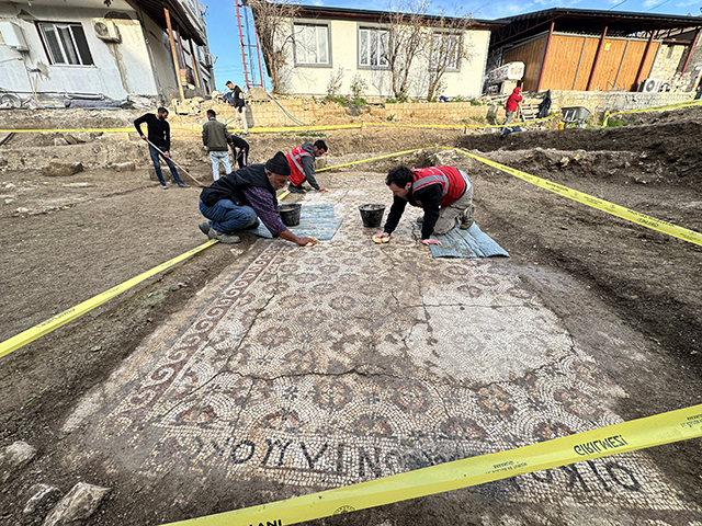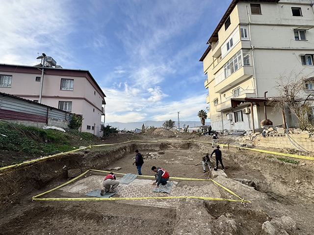 - Antakya ilçesinde depremde yıkılan bir binanın enkazının kaldırıldığı alanda yapılan temel kazısında bulunan 17,5 metre uzunluğundaki mozaikte Grekçe yazıt ve geometrik desenler yer alıyor