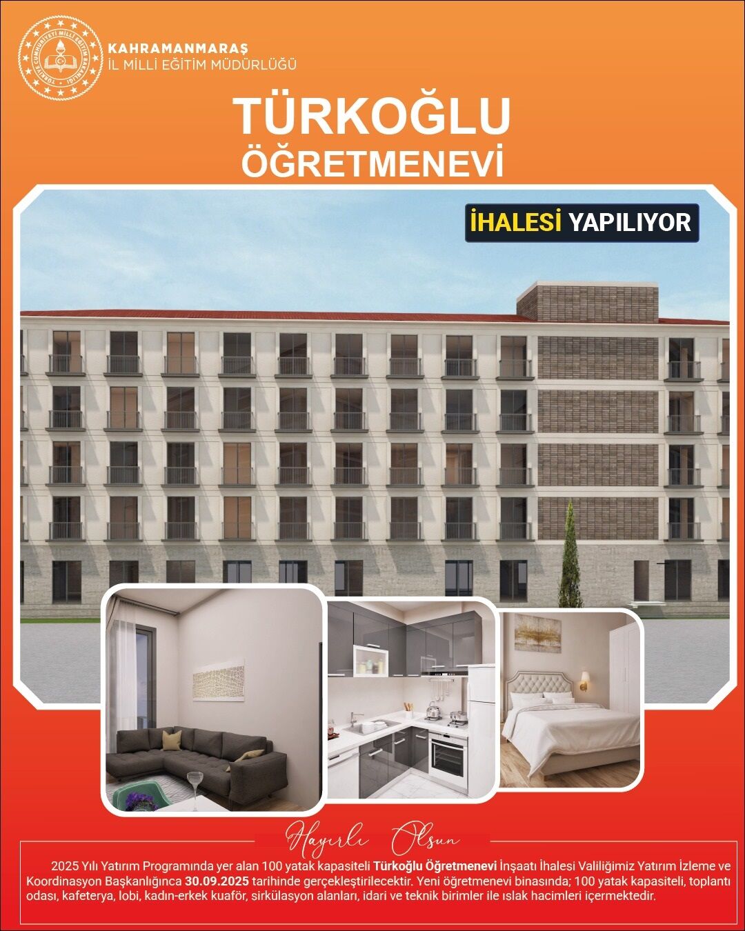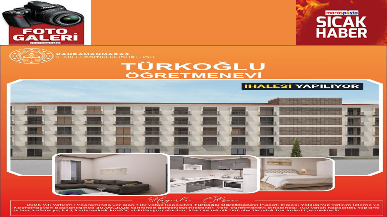2025 yılı yatırım programında yer alan 100 yatak kapasiteli Türkoğlu Öğretmenevi İnşaatı İhalesi, Kahramanmaraş Valiliği Yatırım İzleme ve Koordinasyon Başkanlığı tarafından 30 Eylül 2025 tarihinde gerçekleştirilecek.