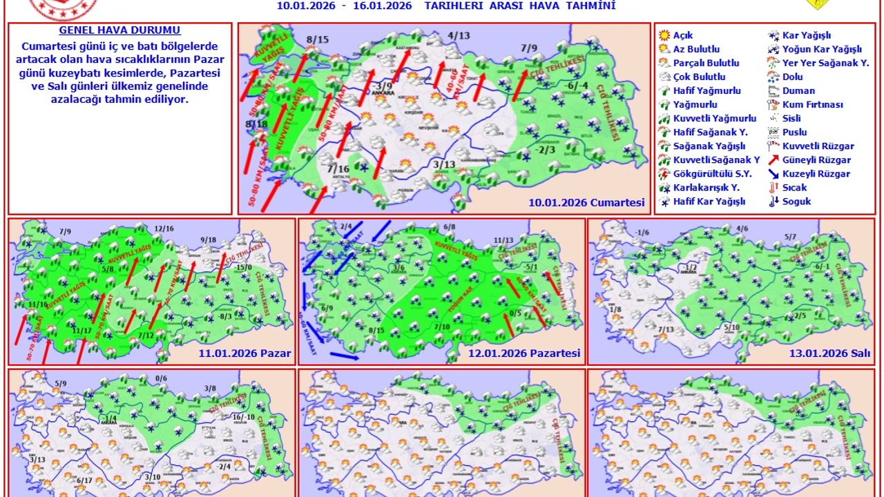 Meteoroloji Genel Müdürlüğü’nün 10–16 Ocak 2026 tarihli hava tahmin raporu, Türkiye genelinde kış koşullarının etkisini giderek artıracağını ortaya koyuyor. Hafta sonu iç ve batı kesimlerde hissedilen görece ılık hava, yeni haftayla birlikte yerini sert soğuklara, kar yağışına ve kuvvetli rüzgârlara bırakacak.