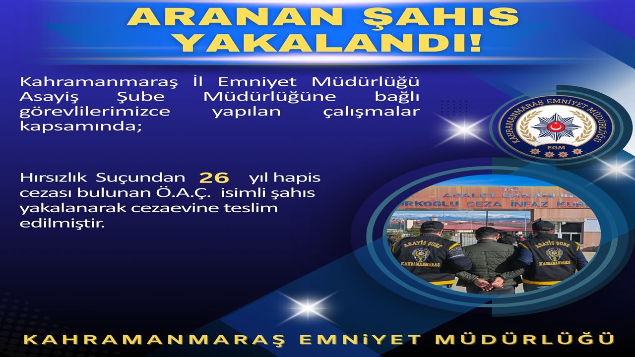 Kahramanmaraş İl Emniyet Müdürlüğü Asayiş Şube Müdürlüğü ekiplerince yürütülen çalışmalar kapsamında, hakkında uzun süredir arama kararı bulunan bir hükümlü yakalanarak adalete teslim edildi.