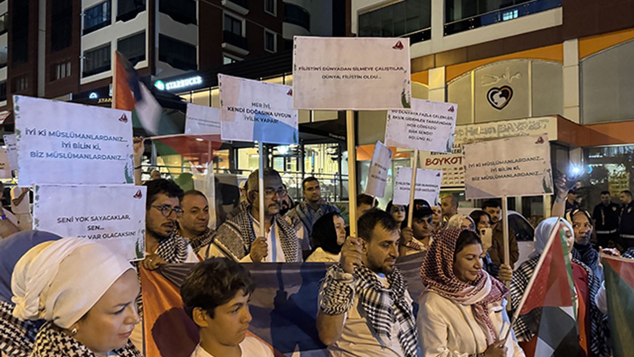 Sosyal medya platformları aracılığıyla bir araya gelen vatandaşlar, Yirmiikigün Mahallesi'ndeki kahve zinciri Starbucks şubesi önünde toplanarak Filistin bayraklarıyla boykot çağrısı yaptı.