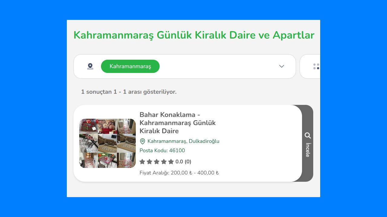 Kahramanmaraş seyahatinizde kötü sürprizlerle karşılaşmamanız için platformumuzda yer alan tüm işletmeler titizlikle seçilir. Hijyen standartları, doğrulanmış fotoğraflar ve gerçek kullanıcı yorumları sayesinde kalacağınız yeri şeffaf bir şekilde görebilirsiniz. Tüm daireler, her misafir çıkışından sonra profesyonel temizlik ekipleri tarafından dezenfekte edilerek yeni misafirlerine hazır hale getirilir.