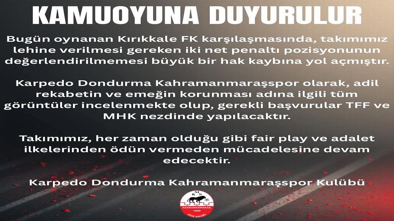 Karpedo Dondurma Kahramanmaraşspor olarak, adil rekabetin ve emeğin korunması adına ilgili tüm görüntüler incelenmekte olup, gerekli başvurular TFF ve MHK nezdinde yapılacaktır.