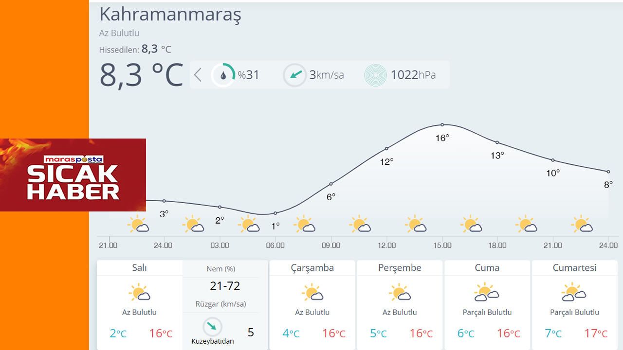 Meteoroloji tahminlerine göre Kahramanmaraş merkez ve ilçelerinde hava az bulutlu olacak. Gece saatlerinde bazı ilçelerde sıcaklıklar -6 dereceye kadar düşerken, gündüz saatlerinde ise 16 dereceye kadar yükselmesi bekleniyor.