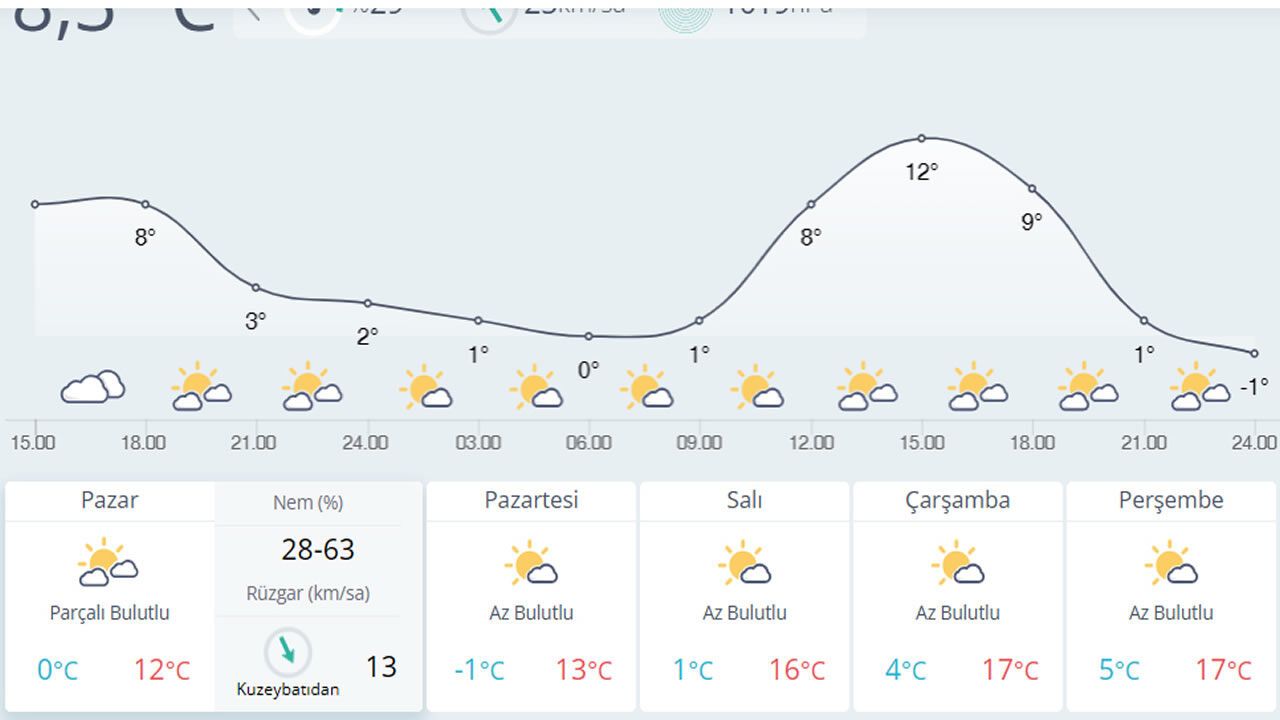 Önümüzdeki günlerde ise kentte daha ılıman bir hava bekleniyor. Pazartesi günü hava az bulutlu olacak ve sıcaklık -1 ile 13 derece arasında değişecek. Salı günü sıcaklık 16 dereceye, çarşamba ve perşembe günleri ise 17 dereceye kadar çıkacak.