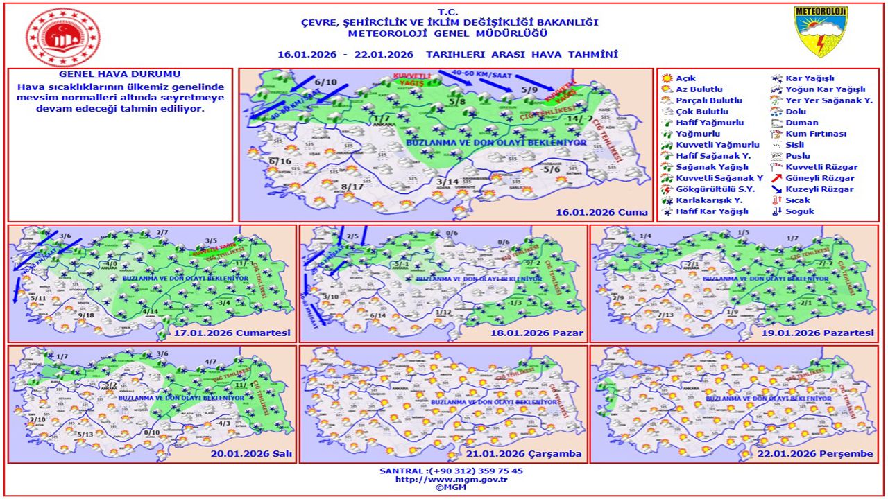 Meteoroloji Genel Müdürlüğü’nün 16–22 Ocak 2026 tarihlerini kapsayan hava tahmin raporuna göre, Türkiye genelinde hava sıcaklıklarının mevsim normallerinin altında seyretmeye devam etmesi bekleniyor. Yeni haftayla birlikte özellikle iç ve doğu kesimlerde kar yağışı, buzlanma ve don olayları etkili olacak.