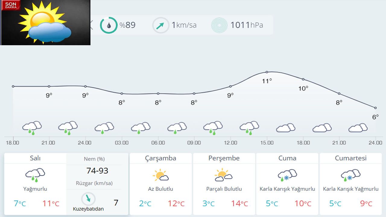 · Cumartesi: Karla karışık yağmur, 5 ila 9 derece