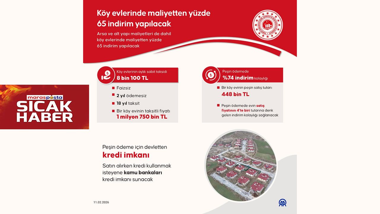 Yeni ödeme planına göre köy evleri için aylık sabit taksit tutarı 8 bin 100 TL olarak belirlendi. Konutlar faizsiz şekilde sunulacak; ilk 2 yıl ödeme alınmayacak, ardından 18 yıl vade ile taksitlendirme yapılacak. Bir köy evinin taksitli satış fiyatı ise 1 milyon 750 bin TL olarak açıklandı.