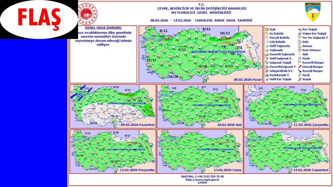 Meteoroloji Genel Müdürlüğü’nün 8–14 Şubat tarihlerini kapsayan son hava tahmin raporuna göre Türkiye genelinde soğuk ve yağışlı hava etkisini sürdürecek.