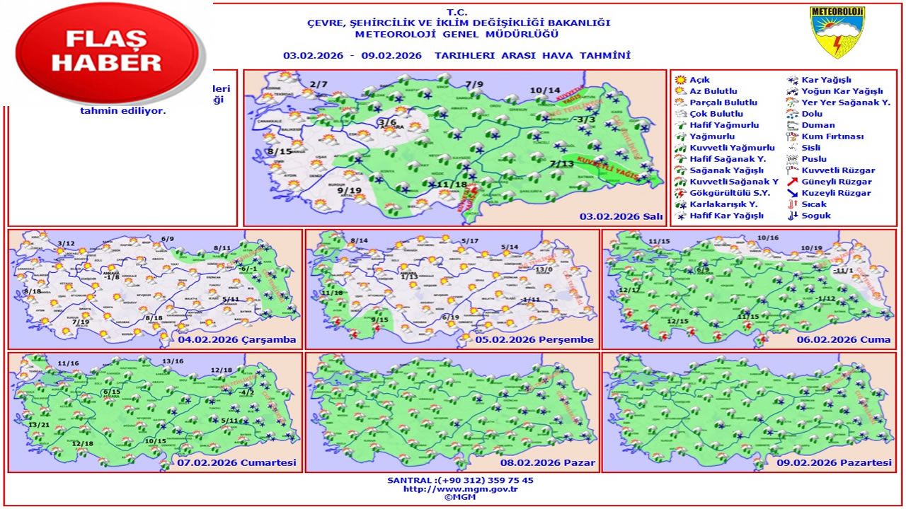Meteoroloji Genel Müdürlüğü, 3–9 Şubat tarihlerini kapsayan haftalık hava tahmin raporunu yayımladı. Yapılan değerlendirmelere göre Türkiye genelinde hava sıcaklıkları mevsim normallerinin üzerinde seyretmeye devam edecek ancak yurdun büyük bölümünde yağışlı sistemler etkili olacak.