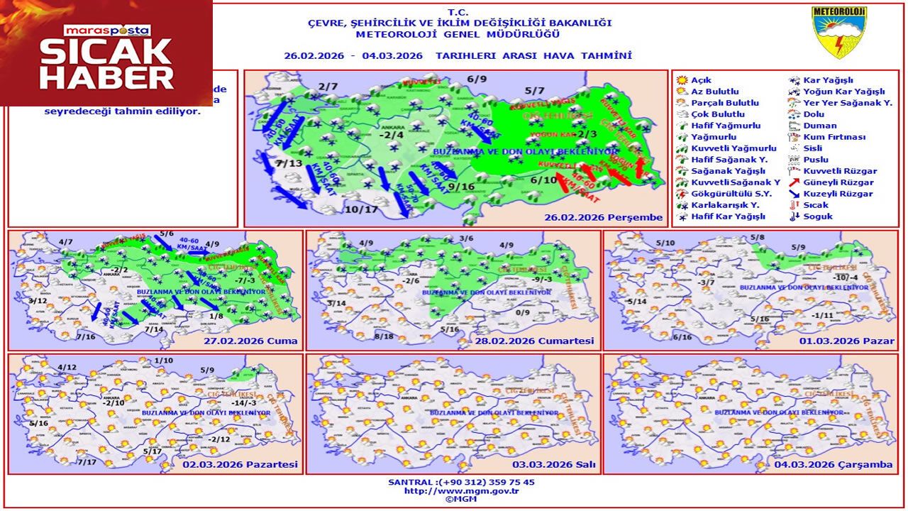 Çevre, Şehircilik ve İklim Değişikliği Bakanlığı Meteoroloji Genel Müdürlüğü, 26 Şubat – 4 Mart 2026 tarihlerini kapsayan haftalık hava tahmin raporunu yayımladı. Rapora göre, hava sıcaklıklarının ülke genelinde azalarak mevsim normallerinin altına ineceği tahmin ediliyor.