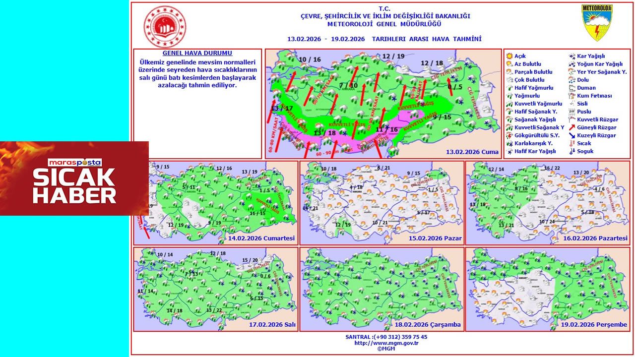 Meteoroloji Genel Müdürlüğü, 13–19 Şubat 2026 tarihlerini kapsayan haftalık hava tahmin raporunu yayımladı. Yapılan değerlendirmelere göre, ülke genelinde mevsim normallerinin üzerinde seyreden hava sıcaklıkları salı gününden itibaren batı kesimlerden başlayarak azalacak.