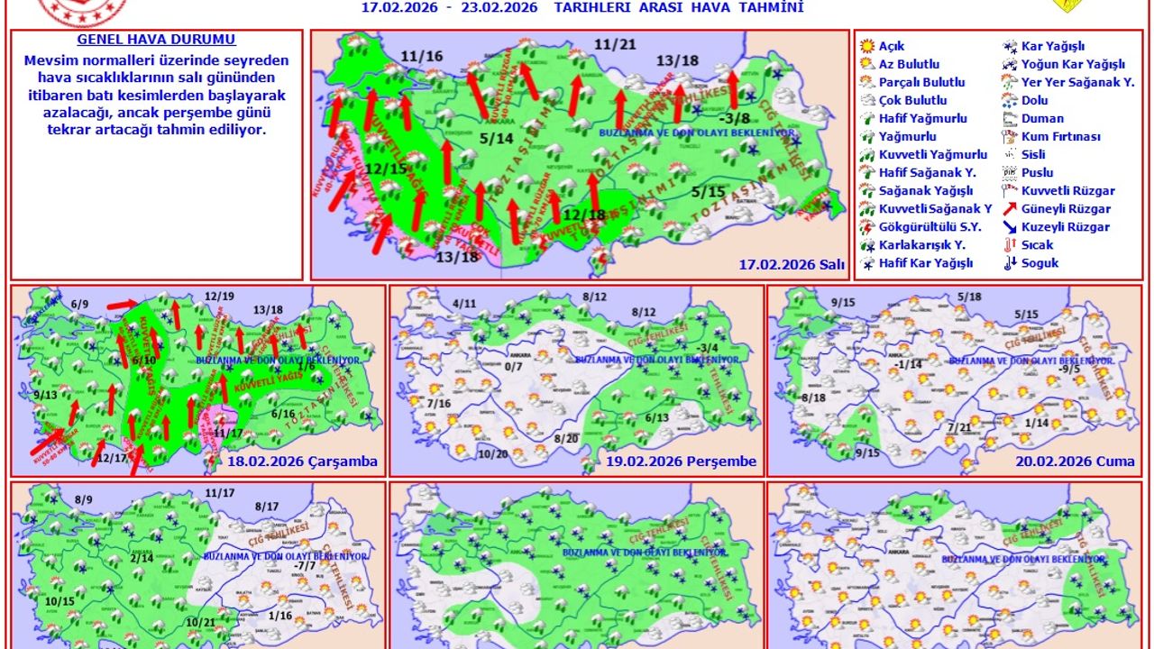 Meteoroloji Genel Müdürlüğü, 17–23 Şubat 2026 tarihlerini kapsayan haftalık hava tahmin raporunu yayımladı. Yapılan değerlendirmelere göre Türkiye genelinde hafta başında yağışlı sistem etkili olurken, ilerleyen günlerde sıcaklıklarda düşüş ve bazı bölgelerde buzlanma ile don olayları bekleniyor.