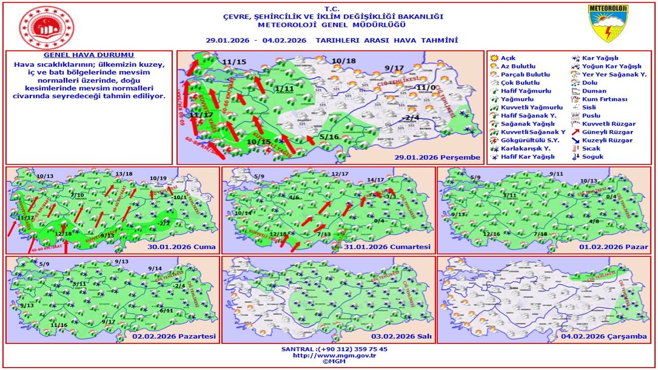 Meteoroloji Genel Müdürlüğü’nün 29 Ocak – 4 Şubat 2026 tarihlerini kapsayan haftalık hava tahmin raporuna göre Türkiye genelinde yağışlı ve yer yer soğuk hava etkisini gösterecek. Özellikle kuzey ve iç kesimlerde sıcaklıklar mevsim normallerinin üzerinde seyrederken, doğu bölgelerde sıcaklıkların normaller civarında kalması bekleniyor.