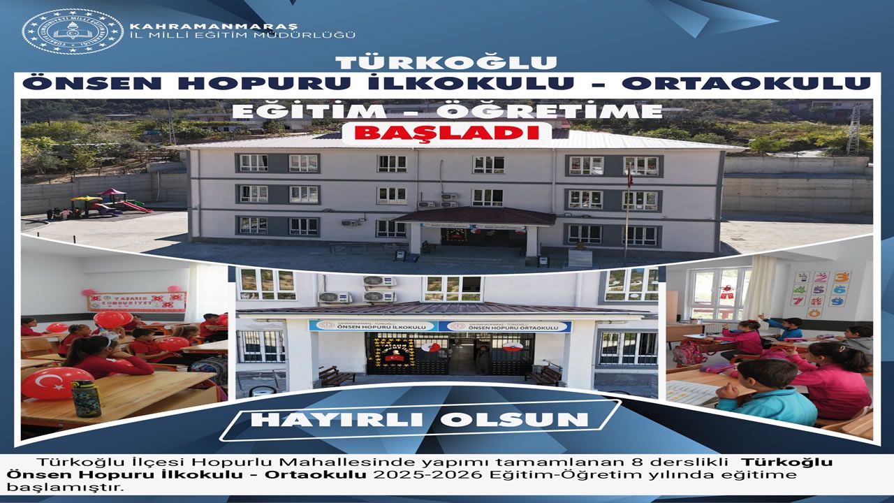 Türkoğlu ilçesinin Hopuru Mahallesi’nde yapımı tamamlanan 8 derslikli Önsen Hopuru İlkokulu–Ortaokulu, 2025–2026 Eğitim-Öğretim Yılı itibarıyla kapılarını öğrencilere açtı.