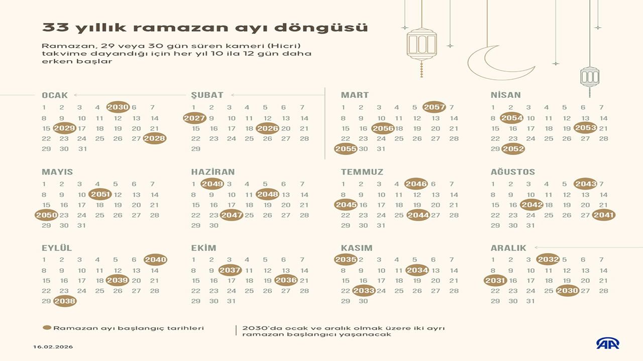 Anadolu Ajansı İnfografik yayınlanan bilgilere göre; Meteoroloji Genel Müdürlüğü’nün (MGM) yayımladığı 33 yıllık takvim döngüsüne göre Ramazan ayı, kameri (Hicri) takvime dayandığı için miladi takvimde her yıl daha erken tarihlere kayıyor. 29 ya da 30 gün süren Ramazan ayı, güneş yılına göre yaklaşık 10-12 gün geriye geldiğinden dolayı 33 yıl içinde yılın tüm aylarını dolaşmış oluyor.