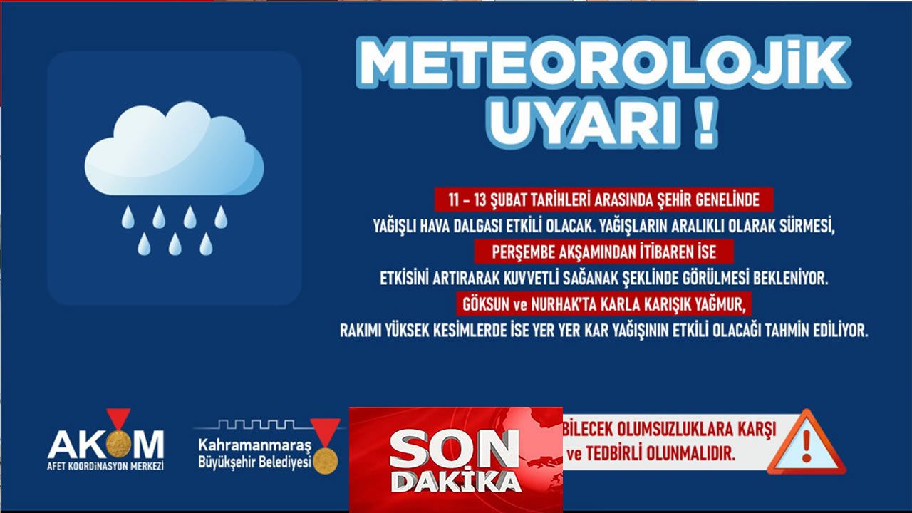 Kahramanmaraş Büyükşehir Belediyesi Afet Koordinasyon Merkezi (AKOM), 11 – 13 Şubat tarihleri arasında şehir genelinde etkili olacak yağışlı hava dalgasına karşı vatandaşları uyardı. Yapılan meteorolojik değerlendirmelere göre, şehir genelinde yağışların aralıklı olarak süreceği, perşembe akşamından itibaren ise etkisini artırarak kuvvetli sağanak şeklinde görüleceği bildirildi. AKOM’dan yapılan açıklamada, yağışların büyük bölümünün yağmur ve sağanak şeklinde olmasının beklendiği belirtilirken, özellikle Göksun ve Nurhak’ta karla karışık yağmur ihtimalinin bulunduğu ifade edildi. Rakımı yüksek kesimlerde ise yer yer kar yağışının etkili olabileceği vurgulandı.