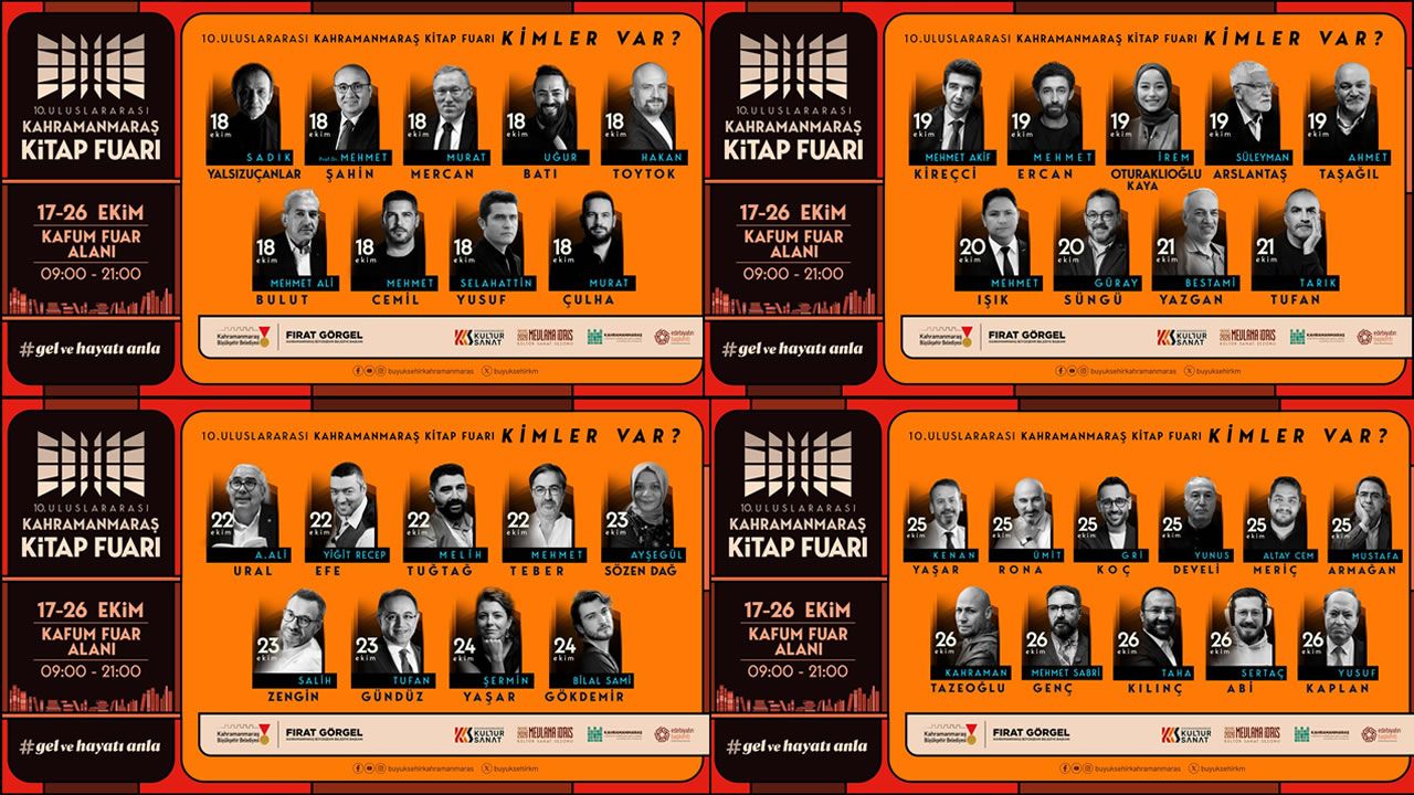 Fuar kapsamında düzenlenecek söyleşiler ve imza günleriyle birbirinden değerli yazarlar okurlarıyla bir araya gelecek. 18 Ekim Cumartesi günü; Sadık Yalsızuçanlar, AK Parti Kahramanmaraş Milletvekili Prof. Dr. Mehmet Şahin, Türkiye’nin eski ABD Büyükelçisi Hasan Murat Ercan, Uğur Batı, Hakan Toytok, Mehmet Ali Bulut, Mehmet Cemil, Selahattin Yusuf ve Murat Çulha okurlarla buluşacak. 19 Ekim Pazar günü; Cumhurbaşkanlığı Güvenlik ve Dış Politikalar Kurulu Üyesi Prof. Dr. Mehmet Akif Kireçci, Mehmet Ercan, İrem Oturaklıoğlu Kaya, Süleyman Arslantaş ve Ahmet Taşağıl fuar ziyaretçileriyle bir araya gelecek. 20 Ekim Pazartesi, Mehmet Işık ve Güray Süngü kitapseverlerle buluşacak. 21 Ekim Salı günü, Bestami Yazgan ve Tarık Tufan söyleşi ve imza programında yer alacak. 22 Ekim Çarşamba; Ali Ural, Yiğit Recep Efe, Melih Tuğtağ ve Mehmet Teber KAFUM sahnesinde okurlarla bir araya gelecek. 23 Ekim Perşembe; Ayşegül Sözen Dağ, Salih Zengin ve Tufan Gündüz, edebiyat dolu bir gün yaşatacak. 24 Ekim Cuma, Şermin Yaşar ve Bilal Sami Gökdemir, düzenlenecek söyleşide kitapseverlerle buluşacak. 25 Ekim Cumartesi; Kenan Yaşar, Ümit Rona, “Gri Koç” olarak bilinen Gökhan Müftüoğlu, Yunus Develi, Altay Cem Meriç ve Mustafa Armağan fuarda sahne alacak. 26 Ekim Pazar ise; Kahraman Tazeoğlu, Mehmet Sabri Genç, Taha Kılınç, Sertaç Abi ve Yusuf Kaplan, fuarın son gününde sevenleriyle buluşarak etkinliğe veda edecek.