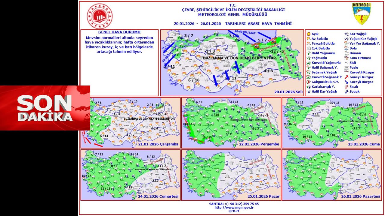 Meteoroloji Genel Müdürlüğü’nün 20–26 Ocak tarihlerini kapsayan tahminlerine göre, Türkiye genelinde hava sıcaklıkları mevsim normallerinin altında seyretmeye devam edecek. Hafta ortasından itibaren özellikle kuzey, iç ve batı kesimlerde sıcaklıklarda kademeli bir artış beklenirken, birçok bölgede buzlanma ve don riski öne çıkıyor.
