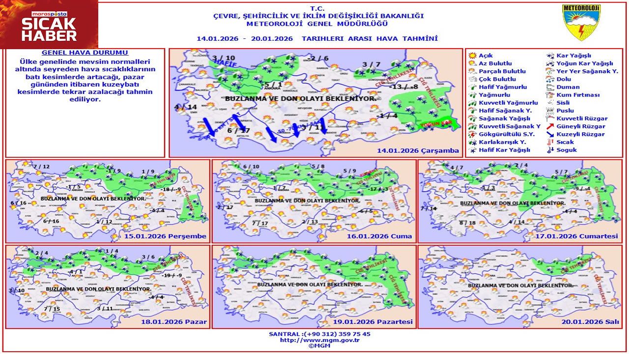 Meteoroloji Genel Müdürlüğü’nün 14–20 Ocak 2026 tarihlerini kapsayan hava tahmin raporuna göre, Türkiye genelinde hava sıcaklıkları mevsim normallerinin altında seyretmeye devam edecek. Özellikle hafta sonuna kadar batı bölgelerde sıcaklıklarda kademeli bir artış beklenirken, pazar gününden itibaren kuzeybatı kesimlerden başlayarak yeniden belirgin bir düşüş öngörülüyor.